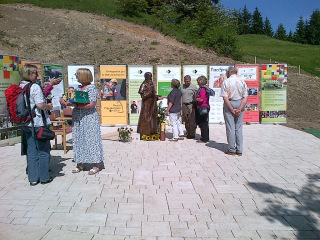 (IINews) - "Dass die hier so viele Ideen haben, dass sie die Ideen umsetzen und die Leute haben, die das machen" - das, so einer der vielen Besucher des Festes in Schönstatt auf"m Berg, Memhölz, macht die Faszination dieses Ortes auf, der seit dem vergangenen Sonntag um eine Attraktion reicher ist: Pater Kentenich zum Anfassen. Über Internet-Fernsehen weltweit übertragen und im Beisein von eigens angereisten Gästen aus Argentinien, Chile, USA, Österreich, der Schweiz und verschiedenen Gegenden Deutschlands, wurde am Vormittag eine in Milwaukee, USA, gefertigte Bronzestatue Pater Kentenichs, des 1968 verstorbenen Gründers der Schönstatt-Bewegung, auf einem neu angelegten Platz auf dem Weg zwischen Schönstatt-Heiligtum und Bildungshaus aufgestellt. Im Leben Pater Kentenichs, so Ehepaar Hinterberger, ist im Liebesbündnis mit Maria vieles möglich geworden, ist Unmögliches möglich geworden. Und dies, so die Erfahrung, geschieht auch da, wo Menschen sich von ihm ansprechen und zum Einsatz bewegen lassen.