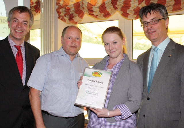 Schukat als stolzer Empfänger der Ökoprofit-Betrieb Auszeichnung 2011 (von links nach rechts: Johannes Remmel (Verbraucherschutzminister NRW), Geschäftsführer Bert Schukat, Jessika Hartmann (Schukat), Nils Hanheide (Umweltdezernent Kreis Mettman).