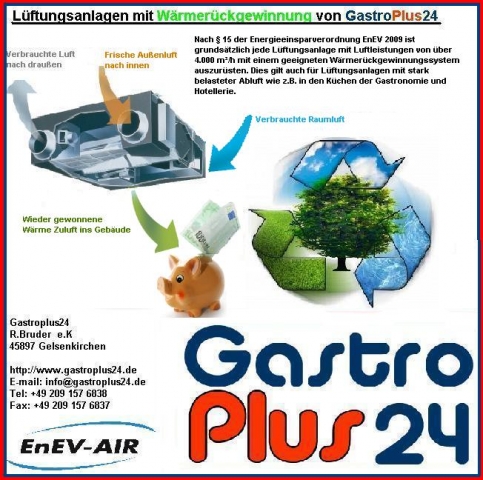 Gastroplus24 ist kompetenter und innovativer Partner für Lüftungstechnik, Abluftreinigung, Küchentechnik und Wärmerückgewinnung für Küchenabluft. Küchenabluft wird vielfach ohne ihr energetisches Potenzial zu nutzen in die Umgebung abgeführt. Befreit man sie von den kritischen Bestandteilen, insbesondere mitgeführter Fette, bestehen mehrere Möglichkeiten zur Wärmerückgewinnung.