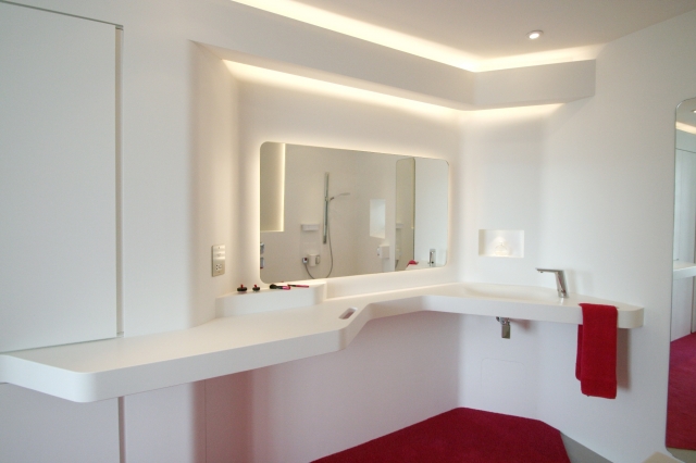 Besonderen Wert wurde bei diesem Bad auf die extrem flächenbündige und fugenlose Verarbeitung des Mineralwerkstoffes HI-MACS® (Produkt und Marke von LG Hausys) gelegt. Obwohl die einzelnen Elemente separat verarbeitet und angebracht wurden, bewirkt die erzielte Optik den hochwertigen Eindruck einer komplett durchgehenden Raumgestaltung ohne erkennbare Fugen.