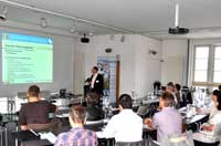 Jan Schulz, Geschäftsführer der Sprachenwelt GmbH, eröffnete die Vortragsreihe und berichtete im Detail von der Arbeit eines Übersetzungsdienstleisters. Dabei stellte er den gesamten Prozess von der Beauftragung der Übersetzung über deren Durchführung bis zur Auslieferung detailliert und anschaulich dar und unterstrich die Vorteile des Einsatzes maschineller Übersetzungstools v. a. für die Übersetzung von technischen Dokumenten.
