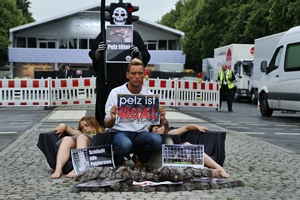 (IINews) - Für Aufsehen bei der Berliner Fashion Week sorgte heute der Protest des Arbeitskreises humaner Tierschutz e.V. Um gegen den Verkauf von echten Pelzen zu demonstrieren, legten sich Aktivisten des Tierschutzvereins vor dem Eingang der Fashion Week nackt in Särge. Flankiert wurden sie von einem Sensenmann, der einen toten Nerz in der Hand hielt. Pelz tötet, so die Botschaft der Tierschützer.