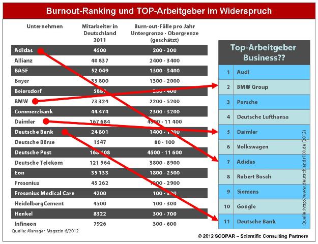 (IINews) - (NL/1370122651) München, den 5. Juli 2012. Viele der TOP-Arbeitgeber, der Besten Arbeitgeber Deutschlands oder auch great places to work belegen bei der aktuellen Burnout-Ranking der DAX-Unternehmen des Manager-Magazins die vorderen Plätze.