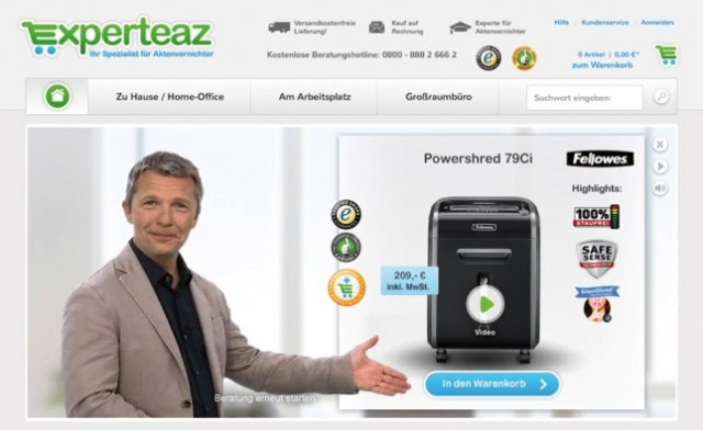 Im Zentrum des Emotional Shopping Konzepts für Experteaz steht die Beratung über ein interaktives Video-Interface. Wie in einem klassischen Beratungsgespräch am PoS ermittelt darin ein Berater den Bedarf des Kunden, indem er diesem Fragen zu Art und Umfang der benötigten Aktenvernichtung stellt. Als Ergebnis der interaktiven Bedarfsanalyse empfiehlt er dem Kunden dann den passenden Aktenvernichter.