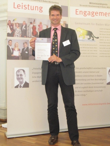 26.06.2012 Stuttgart. Mit der Verleihung des Mittelstandspreises für soziale Verantwortung in Baden-Württemberg werden Firmen, mit großem sozialem Engagementüber die eigentliche Geschäftstätigkeit hinaus, ausgezeichnet. Zu den nominierten Firmen gehört auch die kontech GmbH.