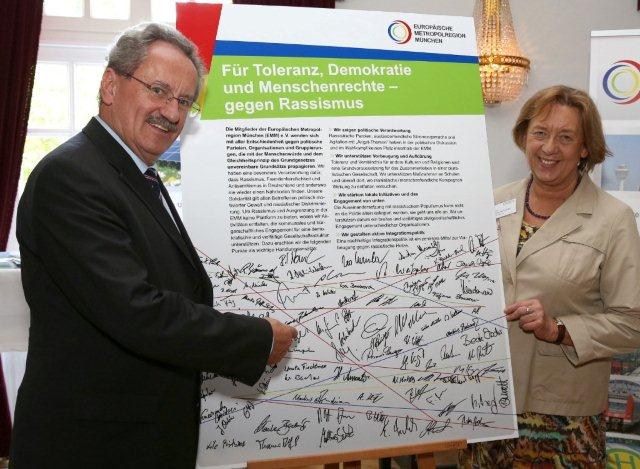 Bad Tölz / München - Im Rahmen der Metropolkonferenz des Netzwerkes Europäische Metropolregion München (EMM e.V.) im Kurhaus Bad Tölz unterzeichneten dessen Mitglieder am 5. Juli 2012 die Resolution „Für Toleranz, Demokratie und Menschenrechte – gegen Rassismus“. Das Grundsatzpapier dient als Basis für zukünftige Aktivitäten der EMM-Mitglieder im Kampf gegen extremistische Strömungen.