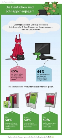 Die Frage nach den Lieblingsprodukten, bei welchen die Internetnutzer am liebsten sparen, teilt die Geschlechter: 65 Prozent der Frauen wollen vor allem bei der Kleidung weniger zahlen, 64 Prozent der Männer bei Elektronik-Artikeln. Bei allen anderen Produkten ist das Interesse gleich: Mehr als 50 Prozent ist daran interessiert, bei CDs, DVDs und Büchern zu sparen, knapp 50 Prozent möchten beim Ticketkauf Prozente bekommen und über 30 Prozent, wenn es um Reisen und Urlaub geht.