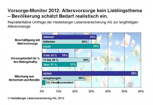 (IINews) - Heidelberg (11.07.2012) - Immer weniger Menschen befassen sich mit ihrer Altersvorsorge. Das Sicherheitsbedürfnis ist unverändert hoch. Gleichzeitig steigt der Realismus, wie viel Geld jeden Monat zurückgelegt werden sollte, um im Alter den Lebensstandard halten zu können. So die zentralen Ergebnisse des "Vorsorge-Monitor 2012" der Heidelberger Lebensversicherung AG. "Das Ergebnis zeigt, dass Finanzberater und Versicherungsmakler noch viel Arbeit vor sich haben", so die Einschätzung des neuen Vorstandsvorsitzenden Michael Sattler.