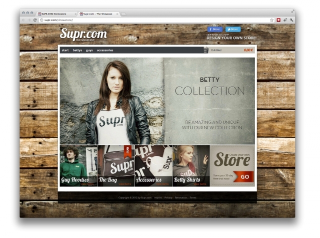 Supr.com ist eine E-Commerce Plattform, die es erlaubt großartige Online Shops zu erstellen. Supr.com richtet sich vor allem an Webdesigner und Shopbetreiber, die Produkte in einem hochqualitativen Rahmen präsentieren wollen. Supr.com wurde im Juli 2012 gestartet und konnte schon in der Testphase über 2.500 aktive Shopbetreiber begeistern.