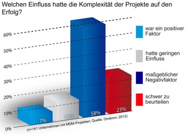 Zu den wesentlichen Erkenntnissen der Studie gehört aber, dass gleichzeitig ein enger Zusammenhang zwischen dem Projekterfolg einerseits und dem Umfang der Optimierungsmaßnahme andererseits ermittelt wurde. So stellt die Komplexität für 58 Prozent einen maßgeblichen Negativfaktor dar, während der weitreichend realisierte Ansatz nur von sieben Prozent der Unternehmen als positiv für den Projekterfolg dargestellt wird. Weitere 12 Prozent bewerten die Auswirkungen der umfangreichen Größe der Maßnahmen relativ wirkungsneutral, ein Fünftel aller Befragten kann den Einfluss der Projektkomplexität auf die Ergebnisse des MDM-Projekts nicht beurteilen.