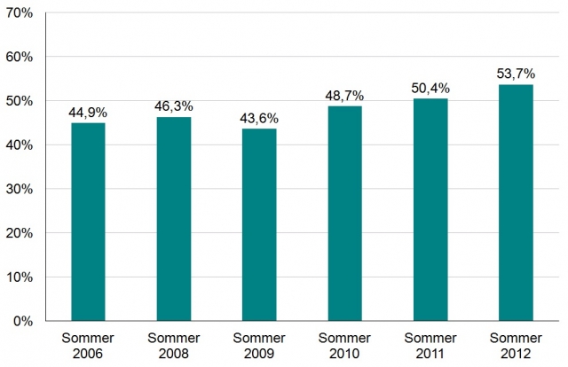 Im Vergleich zum Vorjahr ist die Zahl damit von 50,4 Prozent um weitere drei Prozentpunkte gestiegen. Im Sommer 2009 lag die Zahl mit 43,6 noch rund zehn Prozent niedriger (Graphik 1).