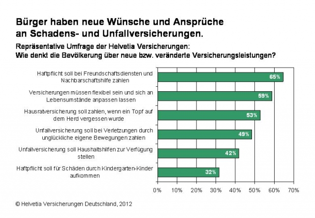Frankfurt, den 14. August 2012. Die Bürger haben neue Ansprüche an die Leistungen von Schadens- und Unfallversicherungen. Ganz oben auf der Wunschliste stehen Leistungen bei Freundschaftsdiensten und Nachbarschaftshilfe (65%) oder bei leichtfertigem Verhalten im Haushalt (53%). Darüber hinaus sollen Versicherungen auch bei Unfällen zahlen, die durch unglückliche eigene Bewegungen entstehen (49%). So das zentrale Ergebnis einer repräsentativen Umfrage der GfK Marktforschung im Auftrag der Helvetia Versicherungen.