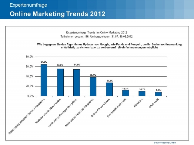 (IINews) - Hamburg, 16. August 2012 - Hochwertiger, relevanter und aktueller Content ist das beste Mittel, um den neuerlichen Google Updates wie Panda oder Penguin zu begegnen, hat jetzt eine Expertenumfrage* der Performance-Agentur eprofessional unter 116 Online-Professionals ergeben. Auf die Frage, welche Maßnahmen derzeit am besten wirken, um ihr Suchmaschinen-Ranking mittelfristig zu sichern, setzen zwei von drei Befragten auf die regelmäßige Integration von aktuellem Content auf der Website. 56 Prozent begegnen den Google Updates mit einer Überarbeitung der Websiteinhalte. Zusätzlich sollten nach Meinung der Experten die Linkbuildung-Strategie (55 Prozent) überprüft und mehr Social Features (38 Prozent) in die Website integriert werden.