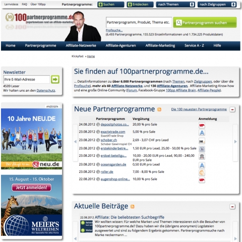 Er bietet Expertenwissen, Informationen und Partnerprogramm-News aus erster Hand. Herzstück ist das große, handgepflegte Partnerprogramm-Verzeichnis mit mehr als 6.000 deutschen und internationalen Affiliate-Programmen. Der 100ppRank zeigt die Qualität der Programme.