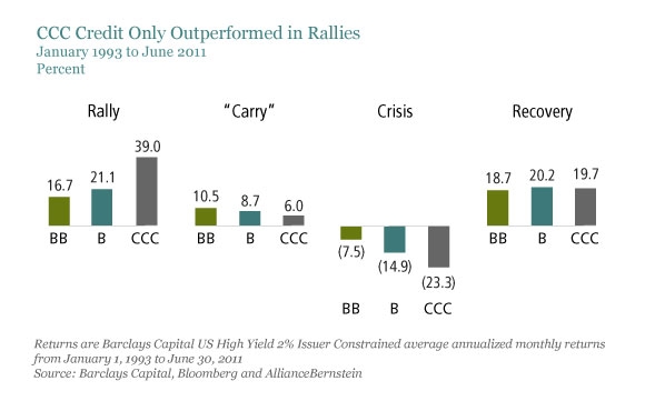 In einer ACMBernstein Studie wurde die Performance der verschiedenen High-Yield-Kategorien auf dem US-Markt zwischen Januar 1993 und Juni 2011 verglichen: Die am höchsten bewertete Kategorie (BB) konnte in wachsenden Märkten 88 Prozent des Aufschwungs mitnehmen - gegenüber 68 Prozent des Abschwungs, als die Märkte wieder einbrachen. "Dieses Muster - mehr vom Aufschwung als vom Abschwung abzubilden - führte zu überdurchschnittlichen und weniger volatilen Ergebnissen", sagt Rudolph-Shabinsky. Am schlechtesten schnitten bei der Untersuchung die mit CCC gerateten Anleihen ab - sie brachten durchschnittliche Erträge von sechs Prozent im Jahr, fast drei Prozent weniger als ihre mit BB bewerteten Pendants. "In anderen Worten: Die risikoärmsten Anleihen performten am besten. Um herauszufinden, warum das so ist, haben wir die Daten in vier unterschiedliche Marktzyklus-Phasen unterteilt: die Rally, die Carry-Phase, die Krise und die Konsolidierungsphase", erläutert Rudolph-Shabinsky.