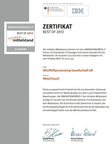 Der INNOVATIONSPREIS-IT der Initiative Mittelstand schlägt im neunten Jahr die Brücke zwischen IT-Innovationen und dem Mittelstand. Die Schirmherrschaft 2012 hat die Bundesbeauftragte für Informationstechnik der Bundesregierung und die IBM Deutschland GmbH.Die Initiative Mittelstand prämiert mit dem INNOVATIONSPREIS-IT Firmen mit innovativen IT-Lösungen und hohem Nutzwert für den Mittelstand. Die Experten-Jury zeichnete die NEURONprocessing Gesellschaft in der Kategorie E-Learning mit dem Prädikat BEST OF 2012 für Web2Touch aus.
