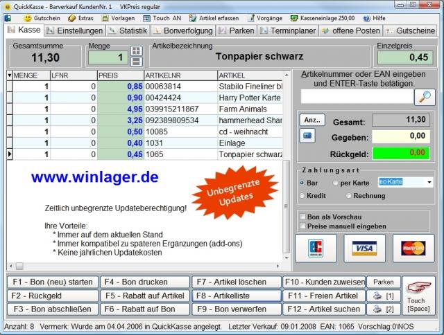 Warenwirtschaft und Kassensoftware bekannt. Kernstück der selbstgeschneiderten Produkte ist das Programm Lager 3000 & QuickKasse, das mit allen Windows-Versionen bestens zusammenarbeitet und besonders einfach zu bedienen ist.
