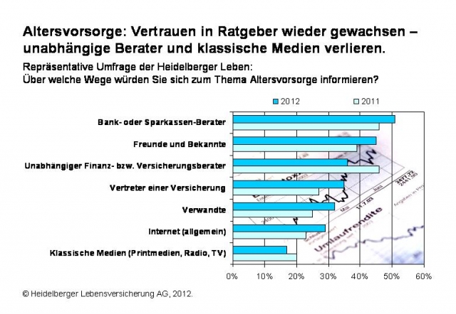 (IINews) - Heidelberg (11.09.2012) - Das Vertrauen der Bundesbürger in professionelle Ansprechpartner aus der Finanzbranche ist gestiegen: Aktuell würden sich die meisten (51 %) über den Berater einer Bank oder Sparkasse zur Altersvorsorge informieren (2011: 46 %). Auf Platz 2 folgen Freunde und Bekannte mit 45 Prozent (2011: 39 %). Auf Rang 3 landen die unabhängigen Finanz- bzw. Versicherungsberater mit 36 Prozent. Sie mussten allerdings Einbußen hinnehmen (2011: 46 %). So das zentrale Ergebnis einer repräsentativen Umfrage der GfK Marktforschung im Auftrag der Heidelberger Lebensversicherung AG.