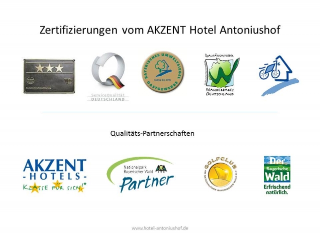 Geschäftsführer, Daniel Giffhorn vom AKZENT Hotel Antoniushof dazu: "Die intelliegente Kombination der Zertifikation eines Hotels, sind der Schlüssel zum Erfolg!" Im Antoniushof haben wir die Zertifizierungen genau auf unsere Hotelgäste abgestimmt. Hotelsterne plus Service Qualität Q 1 in Kombination mit Mystery - Check und iiQ-Check ergeben laufend einen klaren Überblick der Leistungen und der Schwachpunkte. Wanderfreundliches und Fahrradfreundliches Hotel bieten den Urlaubern Annehmlichkeiten besonderer Art und passen perfekt zum eBike-Verleih und der Mitgliedschaft als Nationalpark Partner. Das Bayerische Umweltsiegel in Gold zeigt die regionale Verbundheit und das nachhaltige wirtschaften im Hotel aus. Tagen und Urlaub im Grünen bei einem grünen Gewissen.