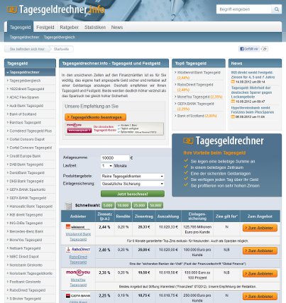 Die Finanzportale www.Tagesgeldrechner.info, www.Festgeld-Zinsvergleich.net sowie www.Tagesgeld-Zinsvergleich.net bieten Lesern neben einem professionellen Tagesgeldrechner sowie Festgeldrechner unabhängige Vergleiche und Ratgeber mit Fachwissen über Tagesgeld und Festgeld an.