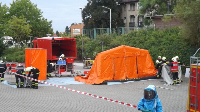 Im vorgeführten Szenario wurde mittels des einsatzbereiten Gefahrenstoffzuges der Wache das kontaminierte Gebiet abgesperrt und eine Dekontaminationsstelle für die eingesetzten Kräfte aufgebaut. Anschließend wurde das verunreinigte Gebiet dekontaminiert und letztlich alle eingesetzten Kameraden, die in speziellen Kontaminationsschutzanzügen agierten, in der Dekontaminationsstelle gereinigt. Die Zuschauer waren beeindruckt.