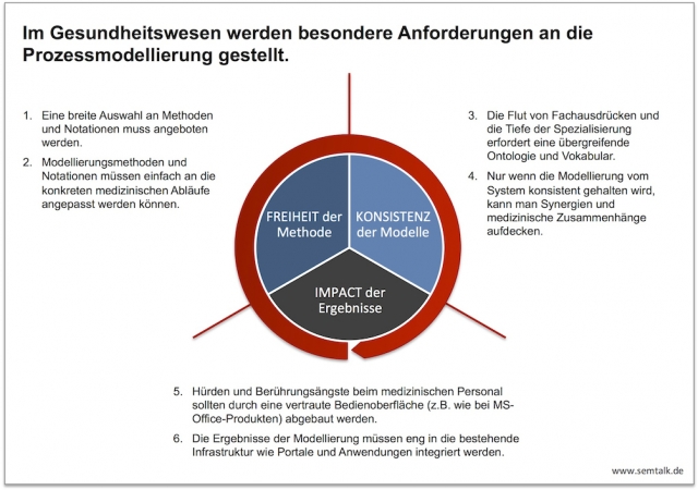 Das Gesundheitswesen stellt mit seiner Fülle an Fachausdrücken und Spezialisierungen besondere Anforderungen an die Prozessmodellierung. Damit zum Beispiel die verschiedenen Abteilungen und Institute eines Klinikums nicht einfach aneinander vorbei modellieren, ist es wichtig, dass das Modellierungswerkzeug die Benutzer mit einer Ontologie und einem einheitlichen Vokabular unterstützt. So wird sichergestellt, dass bestimmte Sachverhalte, die in unterschiedlichen Abteilungen und Zusammenhängen auftauchen, konsistent und übergreifend richtig modelliert werden. Moderne Prozessmodellierungswerkzeuge wie SemTalk führen die Benutzer mit Bibliotheken von bereits modellierten Bausteinen und sorgen so dafür, dass das Rad nicht erneut erfunden wird.