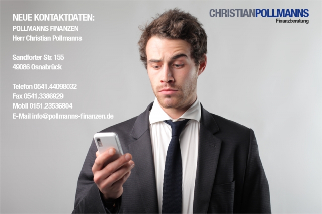 (IINews) - Osnabrück, 09.10.2012 | POLLMANNS FINANZEN sind umgezogen. Ab sofort erreichen Kunden und Interessenten den Osnabrücker Finanzdienstleister unter neuer Telefonnummer. Unter 0514 / 44098032 stehen Christian Pollmanns und seine Mitarbeiter für alle Fragen rund um Finanzen zur Verfügung.