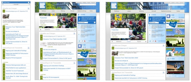 Tablets, Smartphones und internetfähige Fernseher erfahren eine rasante Verbreitung. Besucher erwarten, dass Webseiten auf unterschiedlichen Geräten nicht nur richtig dargestellt werden, sondern auch uneingeschränkt funktionieren, lesbar und bedienbar sind. Damit nicht mehrere Websites für verschiedene Geräte kostspielig umgesetzt werden müssen, entschied sich die Xparo für eine zukunftssichere und effiziente Umsetzung des städtischen Auftritts von Erlangen mit Responsive Webddesign. Die neue Website reagiert dynamisch auf den Websitebesucher. Layout, Design, Menüs, Bilder, Videos, Tabellen oder Schriftgrößen passen sich flexibel an, um die Lesbarkeit und Bedienbarkeit zu gewährleisten, völlig unabhängig von der Auflösung oder dem verwendeten Endgerät.