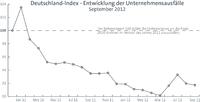 Der Wert 100 bildet die Gesamtheit der deutschen Unternehmen ab, die am 31. Dezember 2010 Gefahr liefen, in den darauffolgenden 12 Monaten auszufallen. Die Entwicklung zeigt, dass der Umfang dieser Gruppe kleiner wird. Stand September 2012 werden 8,3 Prozent weniger Unternehmen ausfallen als noch Ende 2010 errechnet.