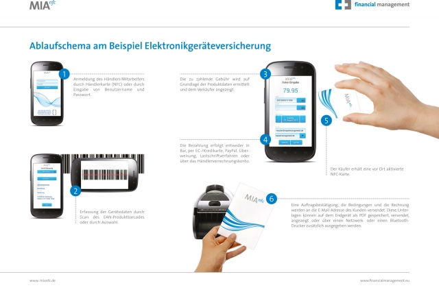 Dank des internationalen Übertragungsstandards Near Field Communication (NFC) können inzwischen kontaktlos Daten über kurze Distanzen zwischen zwei Geräten ausgetauscht werden. Der Informationsaustausch erfolgt über ein elektromagnetisches Feld. "Bewegt man ein NFC-Gerät oder eine Chipkarte in dieses Feld, beginnt die Übertragung", erläutert Andreas Maile, geschäftsführender Gesellschafter der Financial Management GmbH das Verfahren. NFC ist eine Weiterentwicklung der Funksysteme RFID und Bluetooth und hat den Vorteil, dass Geräte und Chipkarten sofort kommunizieren können, ohne sie zuvor aufeinander abzustimmen. Bisher fand die vergleichsweise junge Technik NFC vor allem im Micropayment, dem bargeldlosen Bezahlen kleinerer Summen, Anwendung. Darauf basierend hat der in Offenbach am Main ansässige Finanz- und Versicherungsprofi Financial Management eine mobile Anwendung entwickelt, die den weit komplexeren Abschluss ganzer Vertragswerke erlaubt.