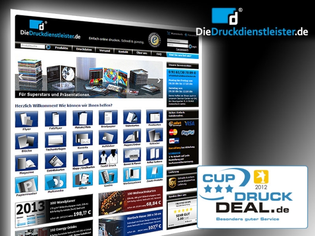 (IINews) - Dietersheim - DieDruckdienstleister.de wurden mit Ihrem Onlineshop für günstige Drucksachen und Werbesysteme jetzt mit dem "Cup-Customer Prize 2012 für besonders guten Service" durch die Jury des Branchendienstes druckdeal.de der German Publishing Group ausgezeichnet. "Wir sind natürlich sehr Stolz über diesen Preis, der auch unsere sehr hohe Kundenzufriedenheit im Allgemeinen wiederspiegelt.", freut sich Thomas Baumann, Geschäftsführer der PrintDorum GmbH & Co. KG. Seit der Gründung der Online-Druckerei im Jahr 2011 wurden sämtliche Unternehmens-Ziele auf maximalen Kundenservice und größtmögliche Transparenz beim Bestellen von Drucksachen ausgelegt. So fiel der Fachjury der für den Preis verantwortlichen German Publishing Group besonders positiv auf, dass "Alle Kundenanfragen persönlich behandelt werden und auf Zusatzkosten für PayPal, Kreditkartenzahlung etc. in dieser Druckerei verzichtet wird", des Weiteren sei der Bestellprozess sehr einfach und ein Video bei den Produkten vereinfache zudem das Bestellen. Neben der transparenten Kostenstruktur und terminierten Lieferzeiten für Express und Overnight-Bestellungen bietet die Onlinedruckerei natürlich auch ein sehr breit gefächertes Produkt-Spektrum. "Von herkömmlichen Geschäftsdrucksachen wie Visitenkarten, Briefpapier, Flyern oder Lesezeichen bis hin zum Kartontrinkbecher mit Firmenbranding oder individuell bedruckten Biertisch-Hussen können wir nahezu alles anbieten was irgendwie bedruckbar ist", so Thomas Baumann.