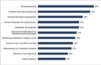 Die IT-Organisationen sind durch operative Aufgaben ausgelastet, so dass kaum Zeit für Innovation bleibt. Die größten Herausforderungen sind Schutz der Informationen (46 Prozent), die effiziente Speicherung der (43 Prozent) und die Kostenfrage zur Beherrschung der Daten (39 Prozent). Grundlegende Aufgaben bestehen also fort und können keineswegs als gelöst betrachtet werden. Hinzu kommen aus IT-Sicht weitere Fragestellungen, etwa nach der Bewältigung der Datenmenge insgesamt, dem Handling des hohen Datenverkehrs und der Datenverwaltung. Die genannten Punkte spiegeln somit die Breite und den Umfang einer Herausforderung wider, die letztendlich und wenn auch in unterschiedlicher Intensität das gesamte Unternehmen durchdringt.