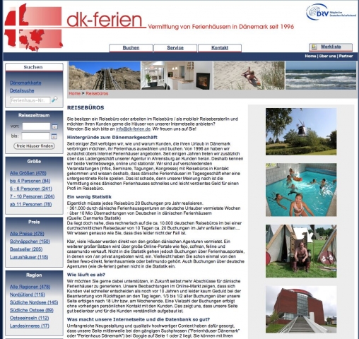 Umfangreiche Neugestaltung und qualitativ hochwertiger Content haben dafür gesorgt, dass www.dk-ferien.de mittlerweile bei den gängigen Suchphrasen ("Ferienhäuser Dänemark" oder "Ferienhaus Dänemark") bei Google auf Seite 1 oder 2 liegt.