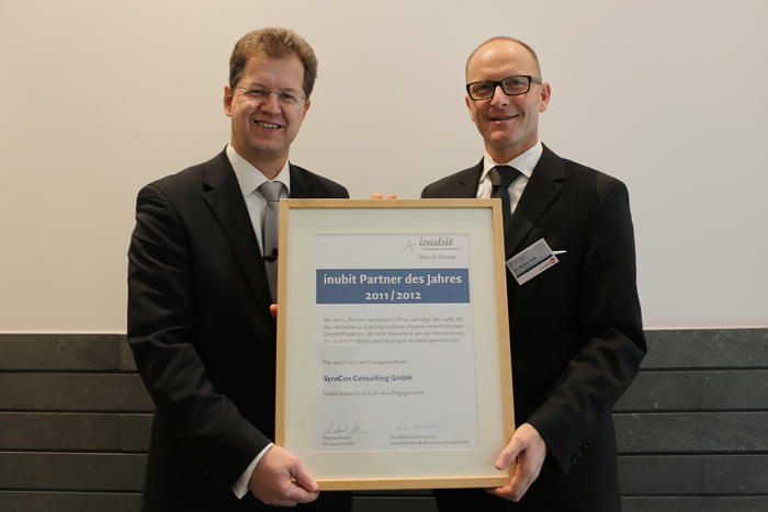 (IINews) - (NL/2595065042) Eschborn/Berlin, 6. November 2012. Das IT-Beratungs- und Systemintegrationsunternehmen SyroCon Consulting GmbH wurde im Rahmen des inubit iDay in Berlin am 15. Oktober 2012 als inubit Partner des Jahres 2011/2012 ausgezeichnet. Die zur Bosch Group gehörende inubit AG, Hersteller der mehrfach ausgezeichneten inubit Suite, überreichte SyroCon-Geschäftsführer Dr. Markus Eisel die Urkunde. Mit dem Preis Partner des Jahres würdigt die inubit AG den aktivsten und erfolgreichsten Partner innerhalb eines Geschäftsjahres, der sich besonders um den Einsatz der inubit Produkte und entsprechender Lösungen verdient gemacht hat.