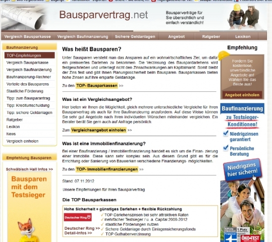 Unter http://www.bausparvertrag.net informieren sich Interessenten rund um das Bausparen, über Bausparkassen sowie Baufinanzierungen. Hier vergleichen wir Bausparverträge für Rendite-Sparer oder Finanzierer.