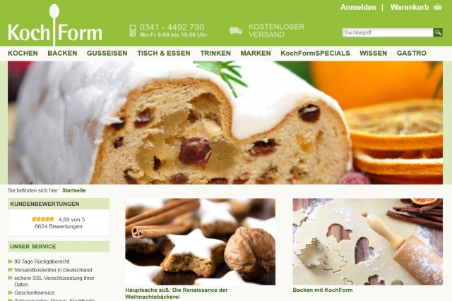 "Das KochForm-Sortiment von über 7.300 Einzelartikeln, Küchengeräten und Sets hält für jede Kochambition das richtige Geschenk vor. Bestellungen treffen in der Regel innerhalb 1-2 Tagen beim Empfänger ein. Immer mehr Privatkunden mit Geschenkwünschen sowie Unternehmen, die über uns Business-Präsente verschicken, wünschen sich für ihre hochwertigen Gaben auch eine einzigartige, persönliche Ausprägung. Genauso hoch im Kurs stehen die KochForm-Geschenkgutscheine (in beliebiger Höhe), die der Beschenkte bei einem Kauf einlöst. Auch ganz kurzfristig kein Problem für unsere Weihnachtswerkstatt! Spätentschlossene nutzen unseren Expressservice."