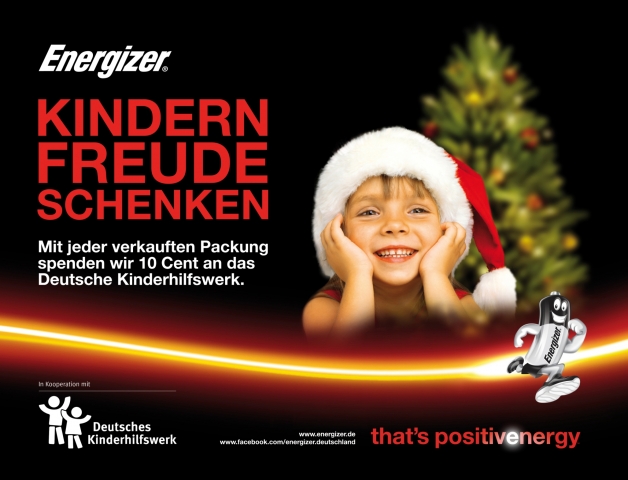 (IINews) - Solingen, 14. November 2012 - Energizer startet zur Weihnachtszeit eine deutschlandweite Spendenaktion zugunsten des Deutschen Kinderhilfswerkes. Damit wird das Deutsche Kinderhilfswerk unterstützt, das sich seit 40 Jahren für Kinderrechte, Beteiligung und die Überwindung von Kinderarmut in Deutschland einsetzt. Denn hierzulande ist jedes fünfte Kind von Armut betroffen. Unter dem Motto "Kindern Freude schenken" spendet der weltweit führende Hersteller von Batterien und Taschenlampen für jede Batterie-Packung, die über die Aktionsdisplays verkauft wird, zehn Cent an den gemeinnützigen Verein. Auf diese Weise sollen mindestens 15.000 Euro zusammenkommen.