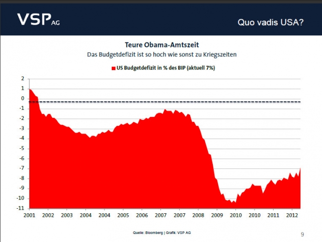 Verlängert der US-Kongress die 2001 und 2003 durch die Bush-Administration beschlossenen Steuersenkungen nicht, treten zum 1.1.2013 durch den von Obama 2011 unterzeichneten "Budget Control Act" und das Erlöschen der Arbeitslosenleistungen quasi über Nacht Ausgabekürzungen und Steuererhöhungen von 600 Mrd. US-Dollar in Kraft. Den einzigen Ausweg aus dem Schuldendilemma bietet alleinig das weitere Ankurbeln der US-Notenbankpresse, da prozyklische Sparmaßnahmen der Obama-Administration die Situation nur noch weiter verschärft werden würden. Weitere Aufschuldungsmaßnahmen sind zudem beschränkt. Durch die Ausweitung der exorbitanten Staatsverschuldung droht letztlich die Zersetzung der Kaufkraft des US-Dollars.