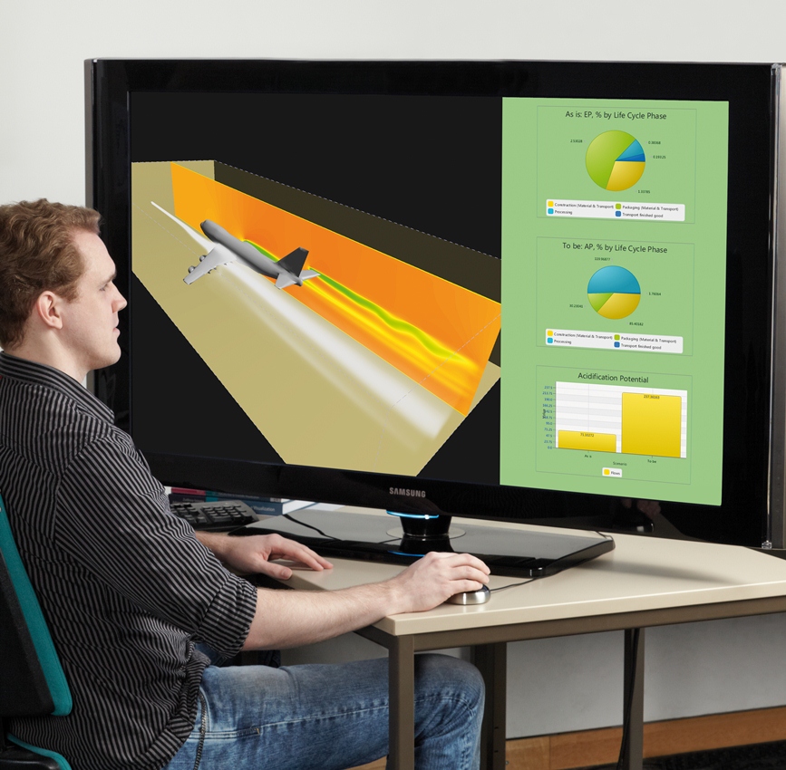Am Fraunhofer IGD, der weltweit führenden Forschungseinrichtung für angewandtes Visual Computing, steht die Ökobilanz der Luftfahrt auf dem Prüfstein. Die Forscher entwickeln zusammen mit der Universität Stuttgart und der Softwarefirma PE International ein intelligentes Werkzeug für Flugzeugdesigner. Mit diesem ist es möglich, die Auswirkungen von Designentscheidungen auf die Umwelt schnell und einfach vorher zu sagen sowie alternative Gestaltungen zu testen. So wird der Produktionsprozess und Betrieb im Hinblick auf seine Umweltverträglichkeit verbessert.
