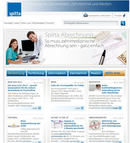 Nach dem Relaunch des Spitta Shop Ende August erstrahlt jetzt auch die Corporate Website des Spitta Verlags unter www.spitta.de in neuem Glanz. Und das Ergebnis kann sich sehen lassen. spitta.de präsentiert sich seit dem 14. November schlank und dynamisch. Ob Abrechnung, Fachinformationen oder Fortbildung - das breite Leistungsangebot des Fachverlags für Zahnmedizin, Zahntechnik und Medizin ist mit einem Blick ersichtlich.