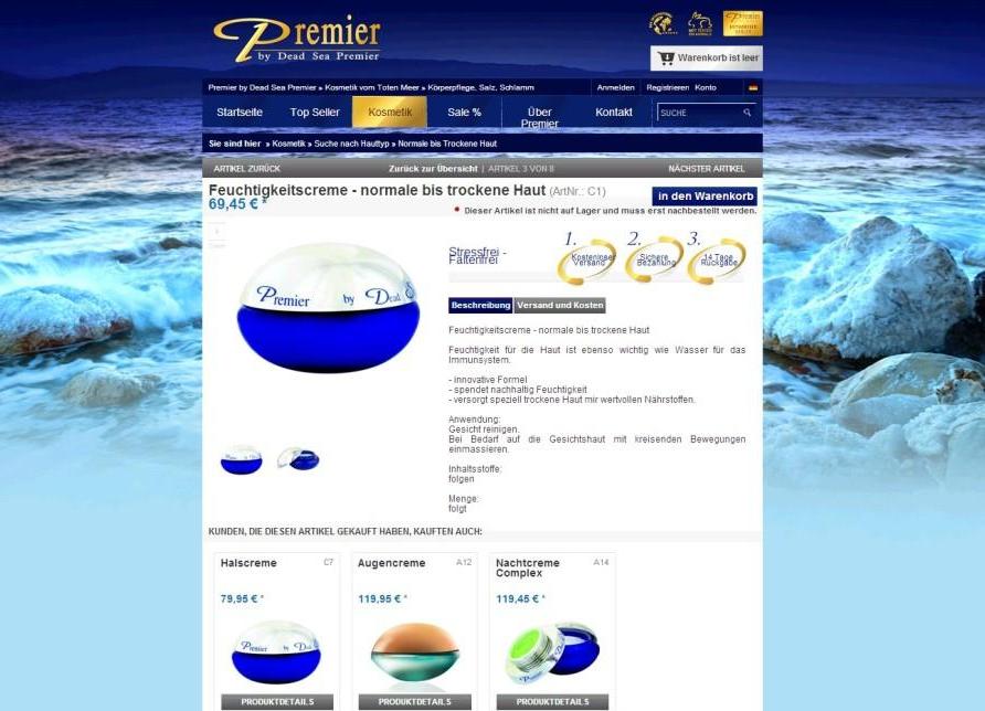 Premier Cosmetics Laboratorien sind ein führender Hersteller von qualitativ hochwertigen Totes-Meer-Kosmetik-Produkten mit Sitz in Berlin. Die Produktpalette umfasst mehr als 80 nachhaltige und umweltschonende Haut-, Haar-, Körperpflege- und Hygieneartikel. Das Unternehmen blickt auf mehr als 20 Jahre Erfahrung zurück und vermarktet seine Produkte bereits in 62 Ländern. Mit dem im April 2012 gelaunchten Online-Shop Premier Dead Sea werden die Produkte nun auch in Deutschland über das Internet verfügbar gemacht und zudem bis zu 70% günstiger als in den üblichen Offline-Geschäften sowie bis zu 50% günstiger als in Online-Shops aus dem Ausland angeboten. Als einziger Online-Shop deutschlandweit besitzt Premier Dead Sea die Verkaufslizenz der Totes-Meer-Kosmetik. Alle Produkte sind ozonfreundlich, recyclebar verpackt und nicht an Tieren getestet. Für diese nachhaltige Produktion wurde Premier Dead Sea in Israel mit dem Qualitätssiegel des Verbands der Hersteller und von der Kosmetikindustrie ausgezeichnet.