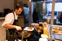Im Innenhof stand der zweite Koch des Abends, Nils Gerhards, der das Catering-Unternehmen Mango Bay in Mönchengladbach führt. Er ging am Gasgrill mit den gleichen Zutaten wie Volker Drkosch an den Start. Gerhards stimmte sich blitzschnell mit dem Sternekoch ab, so dass jede der fünf Runden zeitgleich fertig war. Vor der letzten Runde schätzte Gerhards: „Meine Würstchen kamen, glaube ich, sehr gut an, aber die aromatisierten Karotten sind eventuell etwas im Rauch untergegangen. Ich bin gespannt, wie die Jury urteilt.“