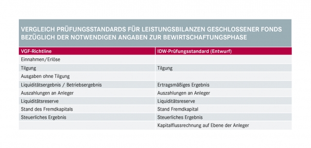 Nach der Leitlinie des VGF muss eine Leistungsbilanz neben dem Soll-Ist-Vergleich des Liquiditäts- bzw. Betriebsergebnisses unter anderem auch Soll-Ist-Vergleiche der Einnahmen bzw. Erlöse eines Fonds und seiner Ausgaben ohne Tilgungen enthalten. Durch diese Angaben kann der Leser erkennen, ob Abweichungen im Betriebsergebnis auf unerwartet geringere Einnahmen oder ungeplant höhere Ausgaben zurück zu führen sind. Der IDW-Entwurf legt seinen Fokus darauf, "was beim Anleger ankommt" und verlangt neben einer Kapitalflussrechnung auf Ebene des Anlegers nur den Vergleich des ertragsmäßigen Ergebnisses des Fonds ohne nähere Aufschlüsselung in Einnahmen oder Ausgaben. Die Kompetenz eines Fondsinitiators als Asset Manager zeigt sich jedoch weniger im Ergebnis sondern vielmehr in den einzelnen Komponenten, die zu dem Ergebnis beitragen.