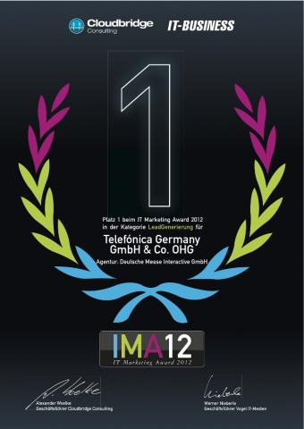 Hannover, 27. November 2012. Die Deutsche Messe Interactive und Telefónica Germany sind mit dem IT Marketing Award (IMA12) der IT-Business für die beste B2B Lead Kampagne 2012 ausgezeichnet worden. Der Preis wurde in der Kategorie Lead Generierung vergeben. Die beiden Unternehmen kooperieren seit September 2012 im Bereich Neukundengewinnung für den Geschäftskundenbereich O2 Business.