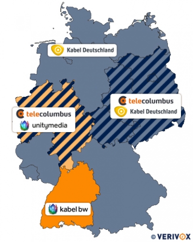 So ist Kabel BW nur in Baden-Württemberg und Unitymedia nur in Nordrhein-Westfalen sowie Hessen verfügbar. Tele Columbus versorgt Teile von Berlin, Brandenburg, Niedersachsen, Nordrhein-Westfalen, Sachsen, Sachsen-Anhalt und Thüringen. Kabel Deutschland ist beinahe flächendenkend aktiv, außer in Baden-Württemberg, Hessen und Nordrhein-Westfalen.
