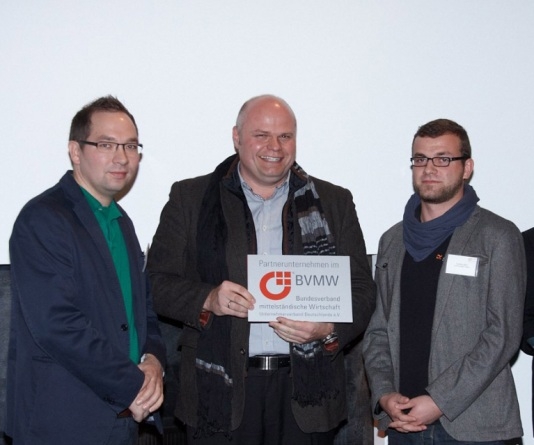 Die ALPHAJUMP GmbH ist Partnerunternehmen des Bundesverbands mittelständische Wirtschaft (BVMW). Im Anschluss an ein Business-Frühstück bei der Firma HUF Haus in Hartenfelsüberreichte Verbandsbeauftragter Achim Wiedemann die offizielle Plakette an Mario Bauer und Torben Bohr, den beiden geschäftsführenden Gesellschaftern der ALPHAJUMP GmbH.