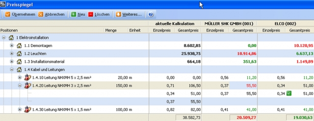 Im neuen Preisspiegel findet der Handwerker schnell das günstigste Angebot. Zuvor ordnet jeder Lieferant den Leistungen des Ausschreibungstextes Artikel aus seinem Sortiment zu. Nach dem Import der Angebote zu einem GAEB-Angebot stellt der Preisspiegel die Preise zu jeder Leistung übersichtlich tabellarisch dar und zeigt den niedrigsten Preis an.