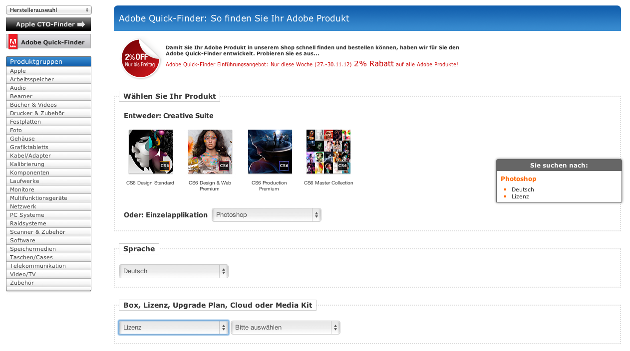 Zusätzlich glänzt der neue Shop durch eine wichtige Neuerung: Gemäß dem Slogan Mit umständlicher Suche ist jetzt Schluss! haben die Flensburger Experten ein effizientes Tool programmiert, was die Suche nach den über 2.000 Adobe-Produkten im Online-Shop stark vereinfacht. Mit dem Adobe Quick-Finder findet jeder Shop-User sein Wunschprodukt mit nur wenigen Klicks.