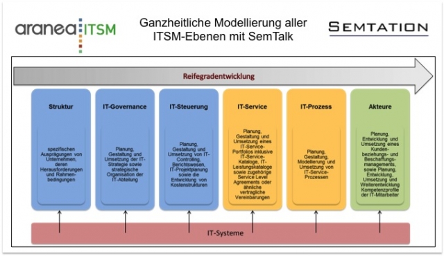 (IINews) - Die araneaNET GmbH, ein auf praxisorientiertes IT-Dienstleistungsmanagement spezialisiertes Beratungs- und Service-Unternehmen aus Potsdam, hat sich für SemTalk als Werkzeug zur Unterstützung des eigenen Beratungsansatzes entschieden. Unter der Marke araneaITSM bietet araneaNET seinen Kunden ein ganzheitliches Beratungskonzept für IT-Service-Management an, mit dem der Kunde sein IT-Service-Management deutlich verbessern kann.
