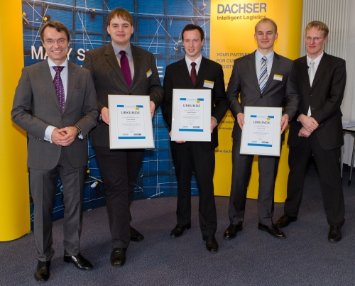 Bildunterschrift: Bernhard Simon, Sprecher der Dachser-Geschäftsführung, Timm Weber von der Universität Münster (3. Platz), Daniel Melzow (1. Platz) und Fabian Lang (2. Platz) von der Universität Duisburg-Essen, sowie Andre Kranke, stellvertretender Chefredakteur der Fachzeitschrift Verkehrsrundschau (von links).